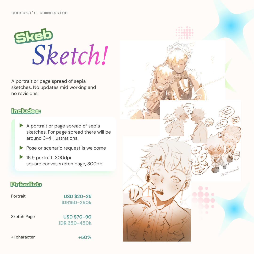 • DO NOT use my works for anything related to AI image generators, NFTs, and cryptocurrency• DO NOT claim commissioned piece as your own work• As the artist, I have the rights to decline your commission if I believe I cannot fulfill your request.• I will fully refund your payment if I am unable to proceed further with your order.• Max. Revisions is 3x. More than that, I will charge you extra $5.• Major revisions such as pose, expression, or concepting can only be done in sketch stage.• Working duration on commission piece will vary depending on complexity.